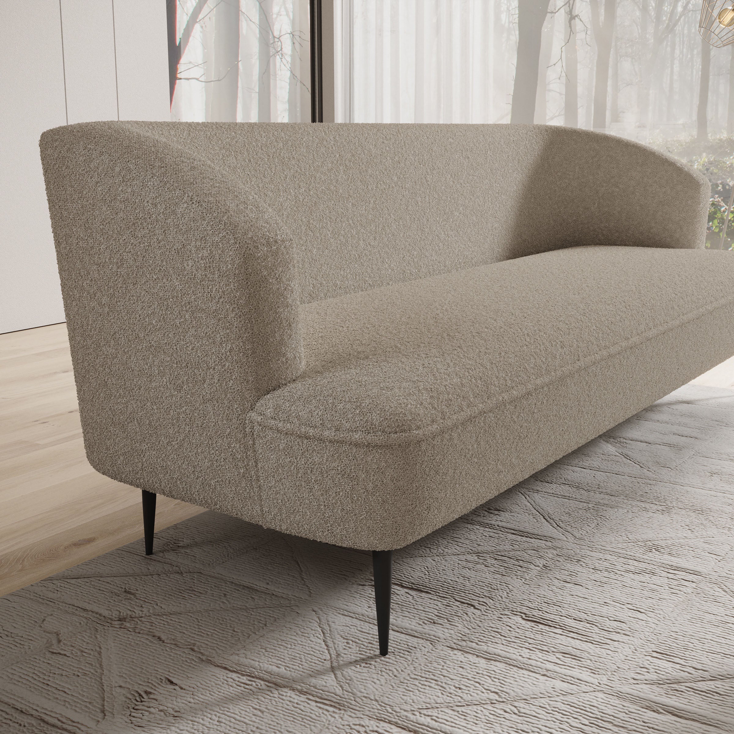 De bank is bekleed met een teddystof van 100% gerecycled polyester – duurzaam en voelt zacht aan. De afgeronde armleuningen en hoge rugleuning zorgen voor een comfortabele zit, terwijl de luchtige zwarte pootjes van 17 cm het geheel elegant en modern houden.