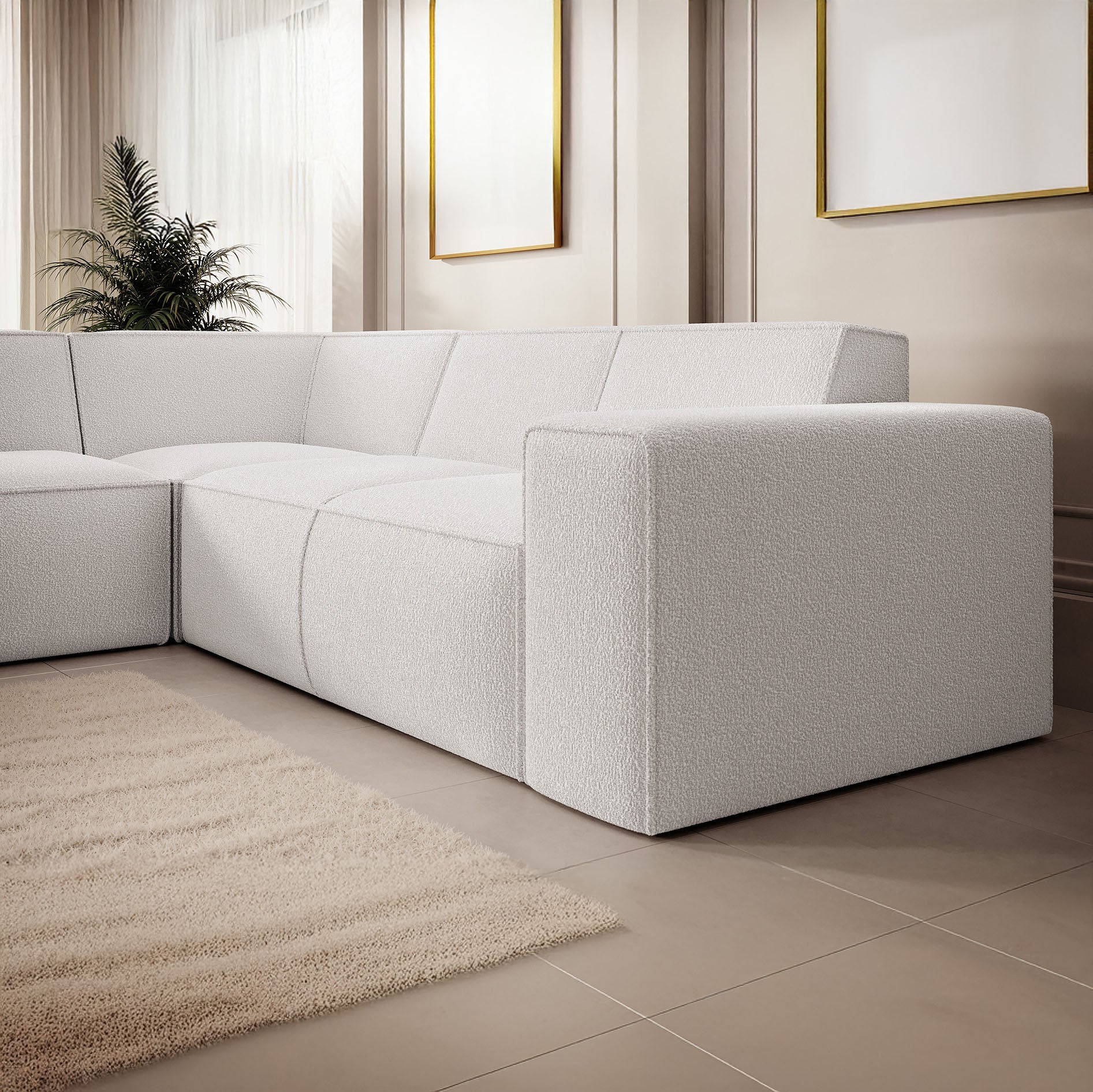 De hoekbank is bekleed met zachte teddystof in een lichte witte tint – een trendy en tijdloze keuze die direct sfeer toevoegt aan je woonkamer. De luxueuze boucléstructuur voelt zacht aan en zorgt voor extra comfort, terwijl de vaste rug- en zitkussens zorgen voor een strakke, opgeruimde look.