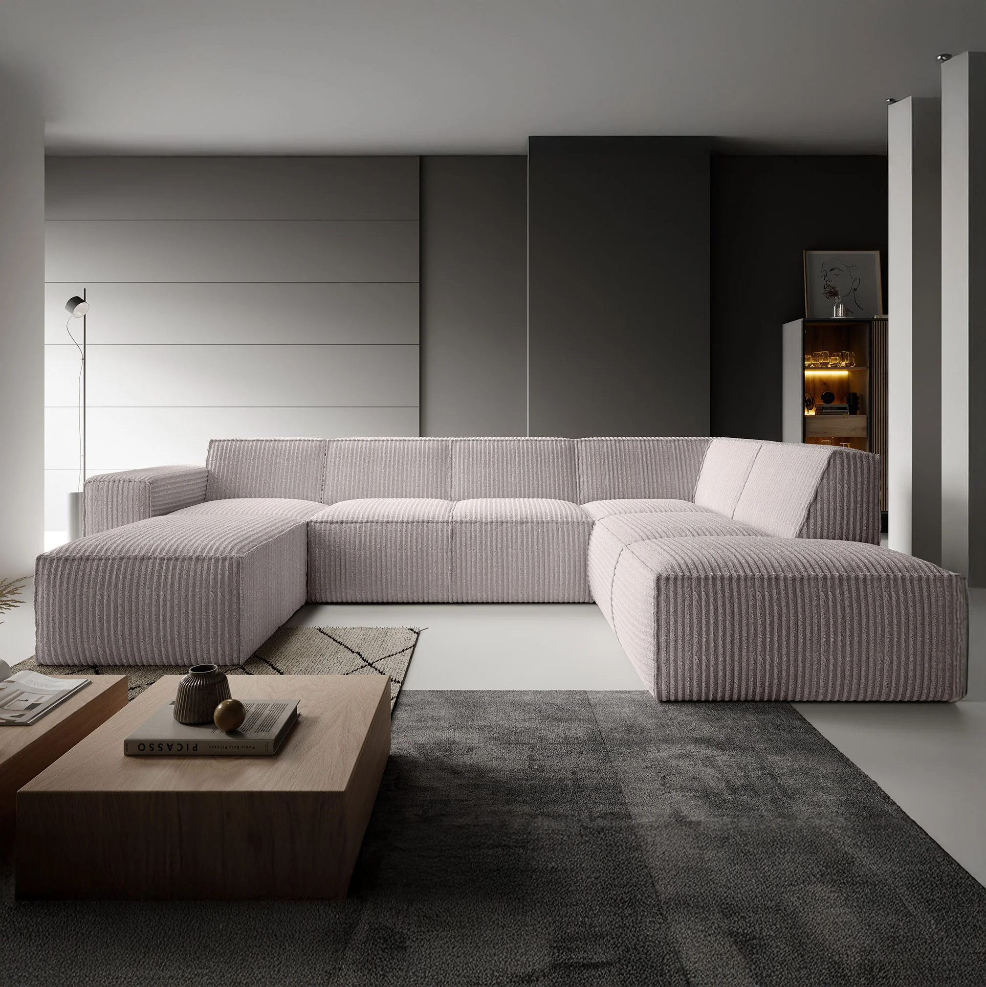 Hoekbank Monet XL is een royale loungebank met plek voor 6 tot 7 personen. De bank is uitgevoerd in een zachte fluffy ribstof in beige kleur en heeft een moderne, uitnodigende uitstraling.