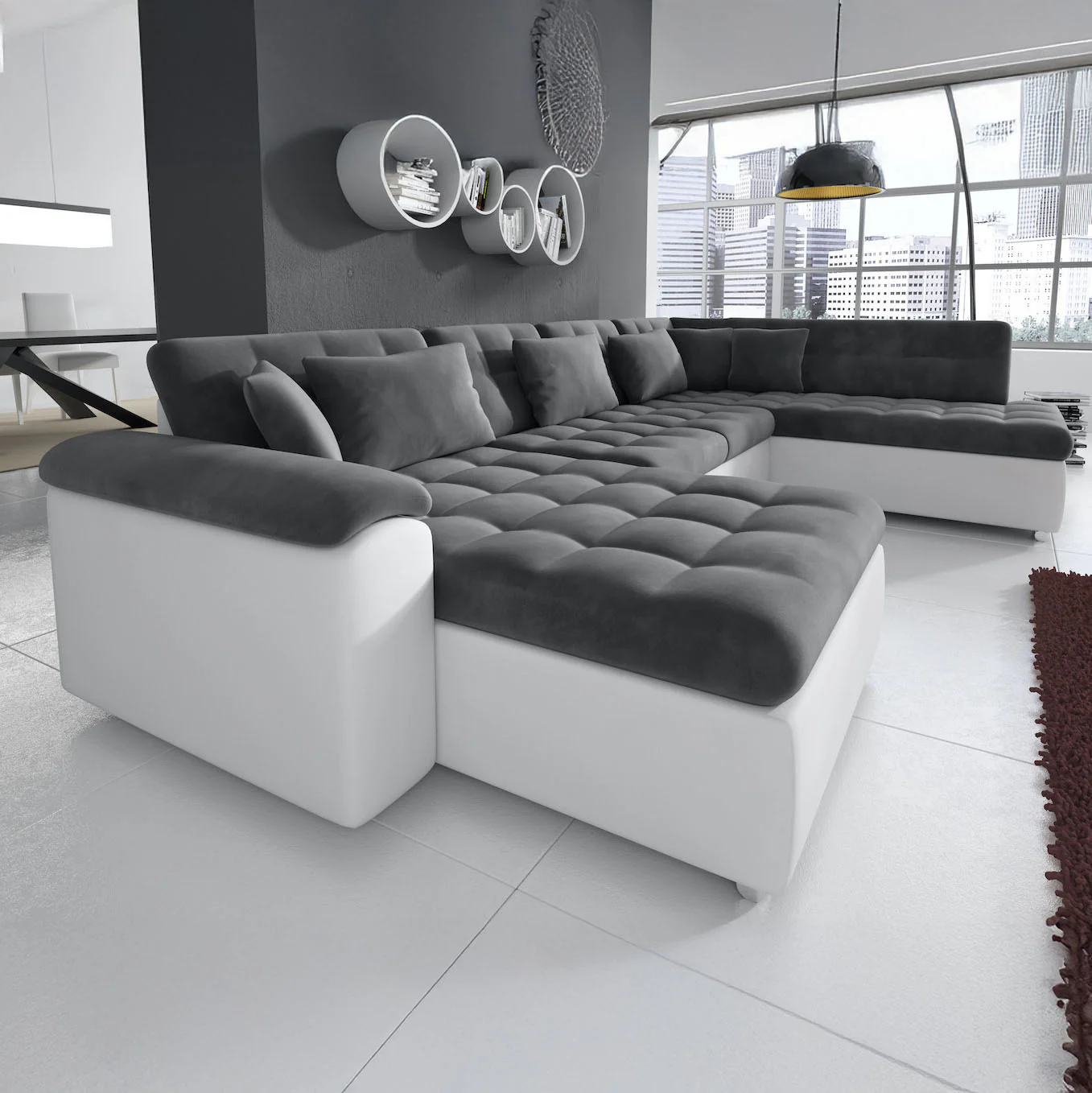 Met hoekbank Nicoreta haal je een royale en moderne zitplek in huis. De combinatie van de grijze velvet stof met witte lederen look accenten geeft deze bank een eigentijdse, maar warme uitstraling. De ruime U-vormige opstelling biedt plaats voor 5 tot 6 personen.