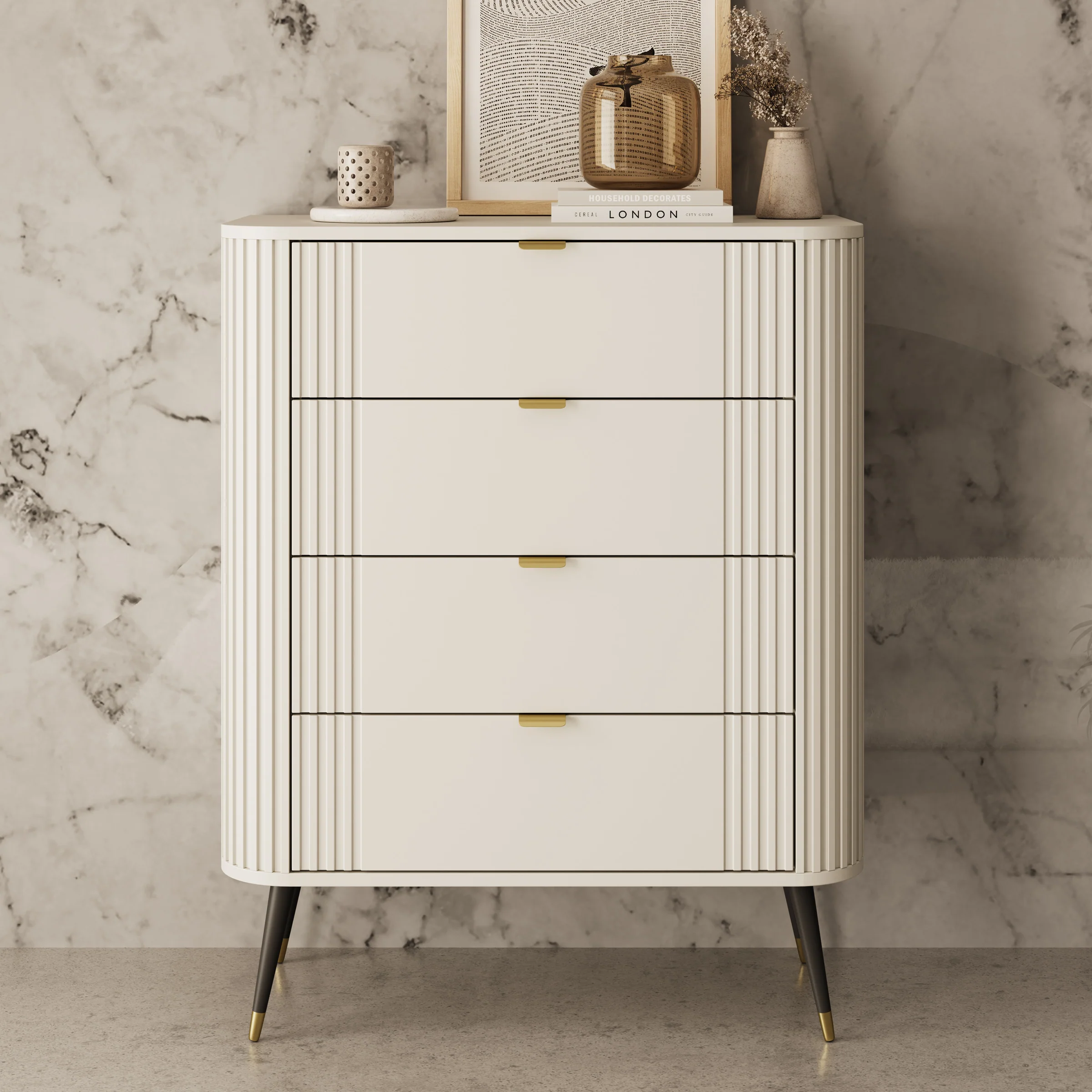 De Oahu ladekast is uitgevoerd in een rustige beige kleur en heeft een kenmerkend ontwerp met verticale lijnen langs de voorzijde. Dit geeft de kast een moderne uitstraling die goed past in zowel minimalistische als sfeervolle interieurs. De goudkleurige handgrepen en de slanke poten met goudaccent zorgen voor een subtiel luxe detail.