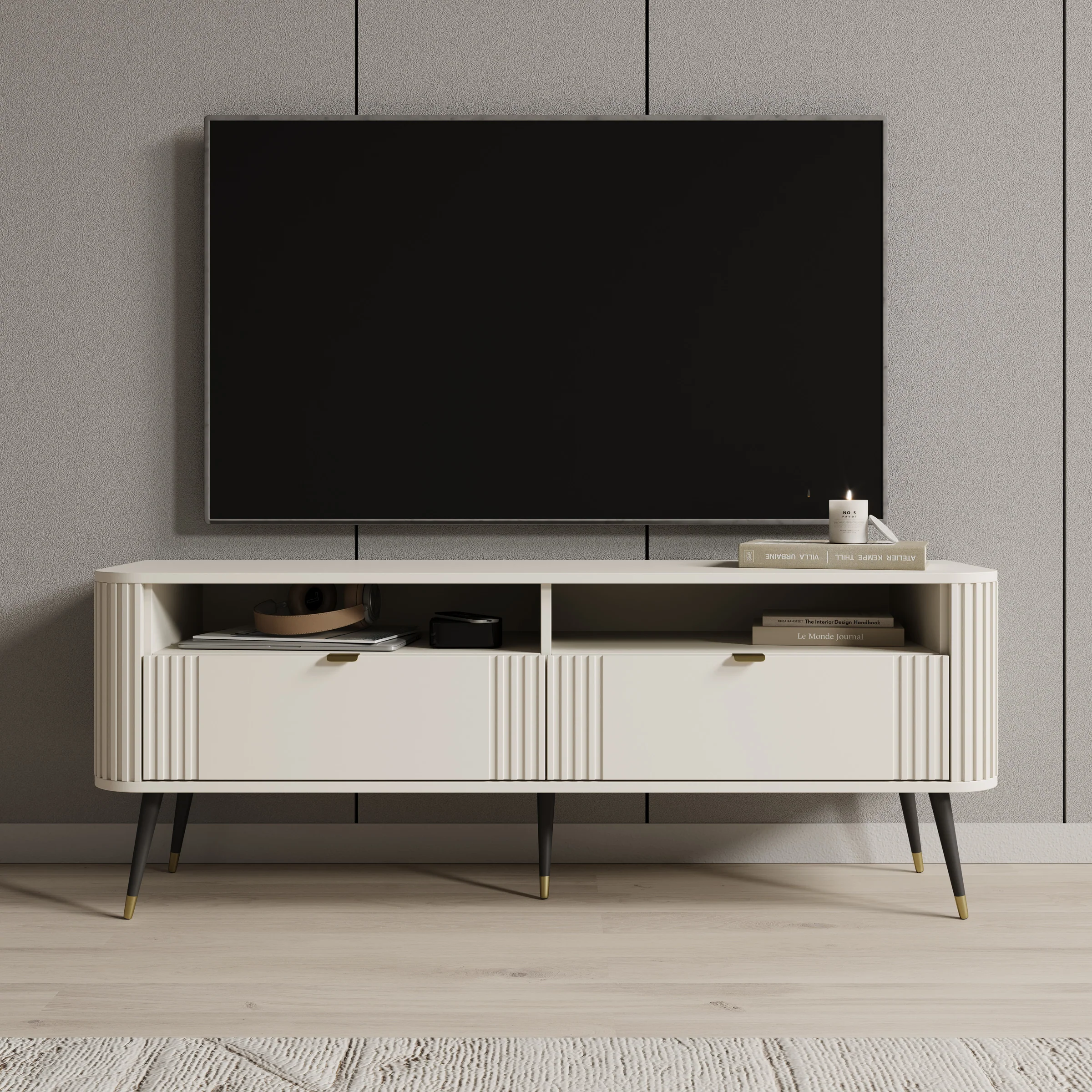 Het meubel heeft twee opbergvakken achter kleppen, ideaal voor het opbergen van afstandsbedieningen, kabels en andere accessoires. Boven de kleppen vind je twee open vakken voor apparatuur zoals een decoder of spelcomputer. De slanke zwarte poten met goudkleurige accenten geven het geheel een moderne uitstraling.