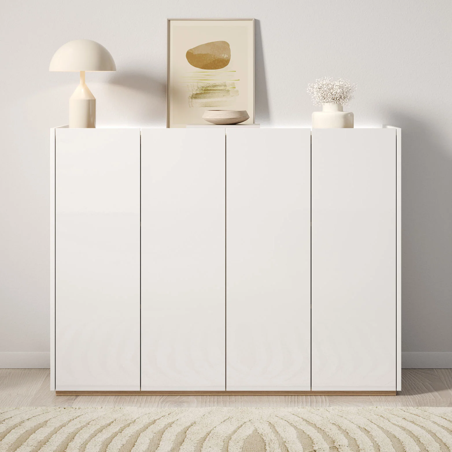 Schoenenkast Encore is een modern meubel die geschikt is voor het opbergen van je schoenen. De kast is voorzien van 4 greeploze deuren die te openen zijn via de bovenkant. Achter deze deuren zitten 6 opbergvakken. Aan de achterzijde aan de bovenkant kan je LED-verlichting plaatsen. Het meubel is uitgevoerd in wit met hoogglans witte voorkant. Het bovenblad is gemaakt in een eiken kleur.
