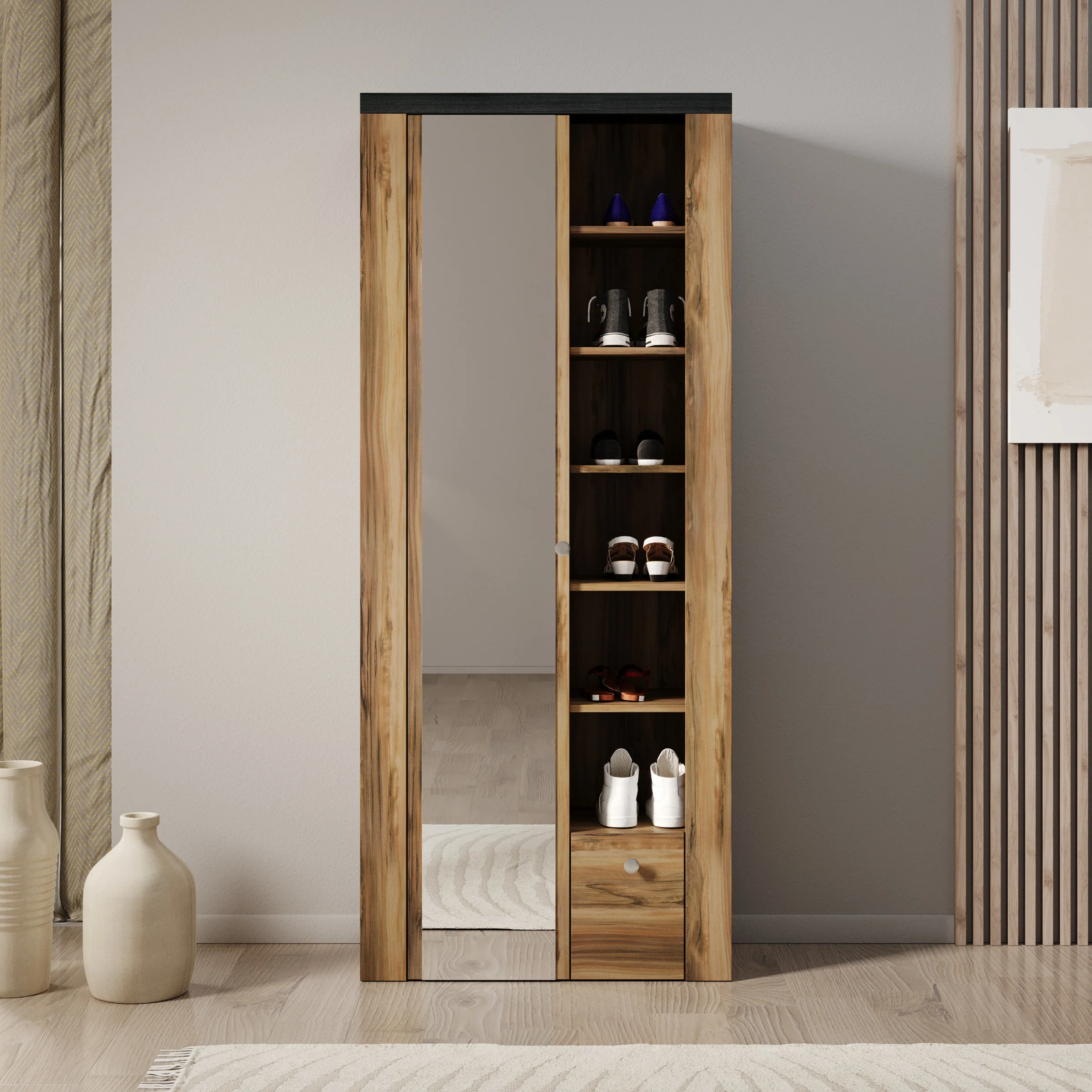 Schoenenkast Linford is een praktische opbergkast voor schoenen, voorzien van 1 scharnierdeur, een spiegel en een extra lade. Achter de deur bevinden zich 13 vakken van verschillende hoogtes voor het overzichtelijk opbergen van schoenen. De lade biedt extra ruimte voor accessoires zoals schoenlepels of veters. Dankzij de spiegel op de deur is de kast ook functioneel bij het klaarmaken voor vertrek. Uitgevoerd in donker eiken met een zwarte bovenrand.