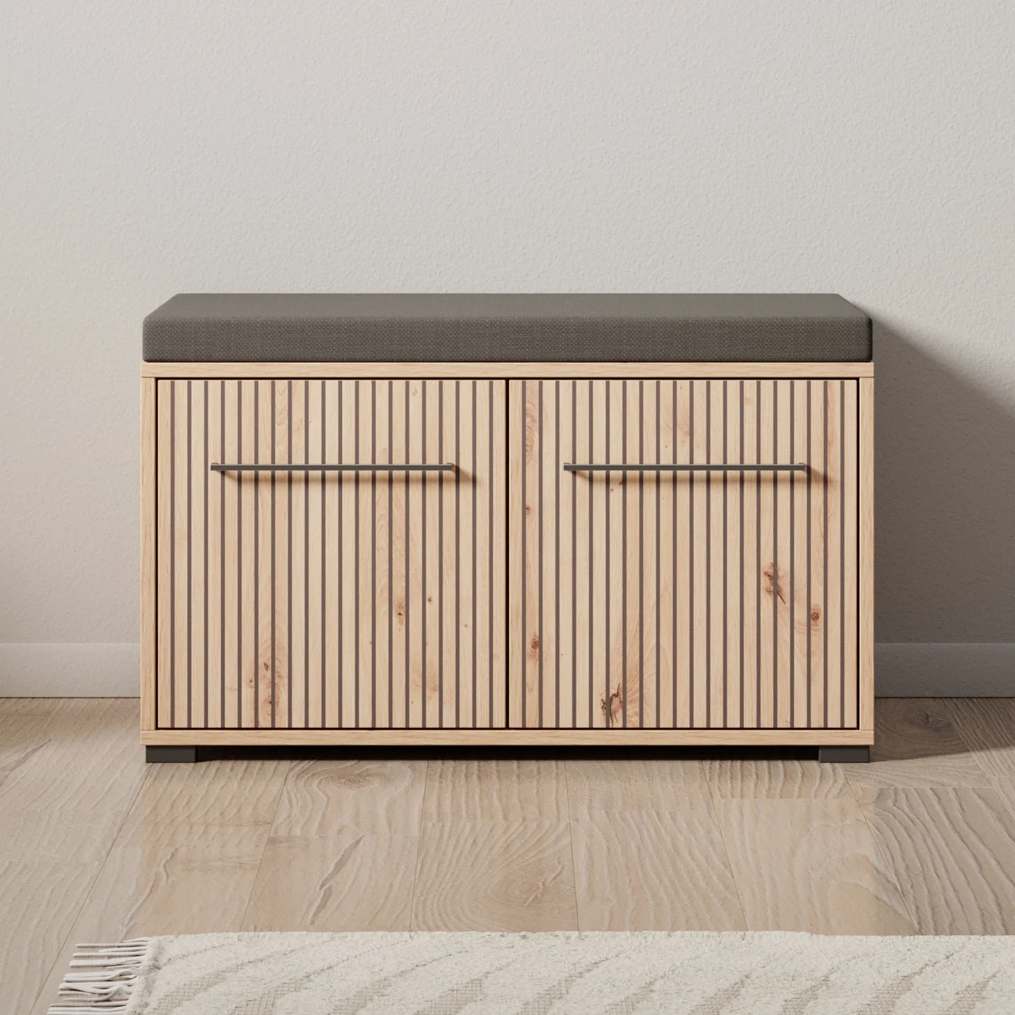 Schoenenkast Lobos is een modern meubel in de kleur eiken, welke is geschikt voor het opbergen van je schoenen. Het kastje is voorzien van 2 deuren die te openen zijn met een zwarte handgreep. Hierachter zitten in totaal 2 opbergvakken. Het meubel heeft een kussentje op het bovenblad.