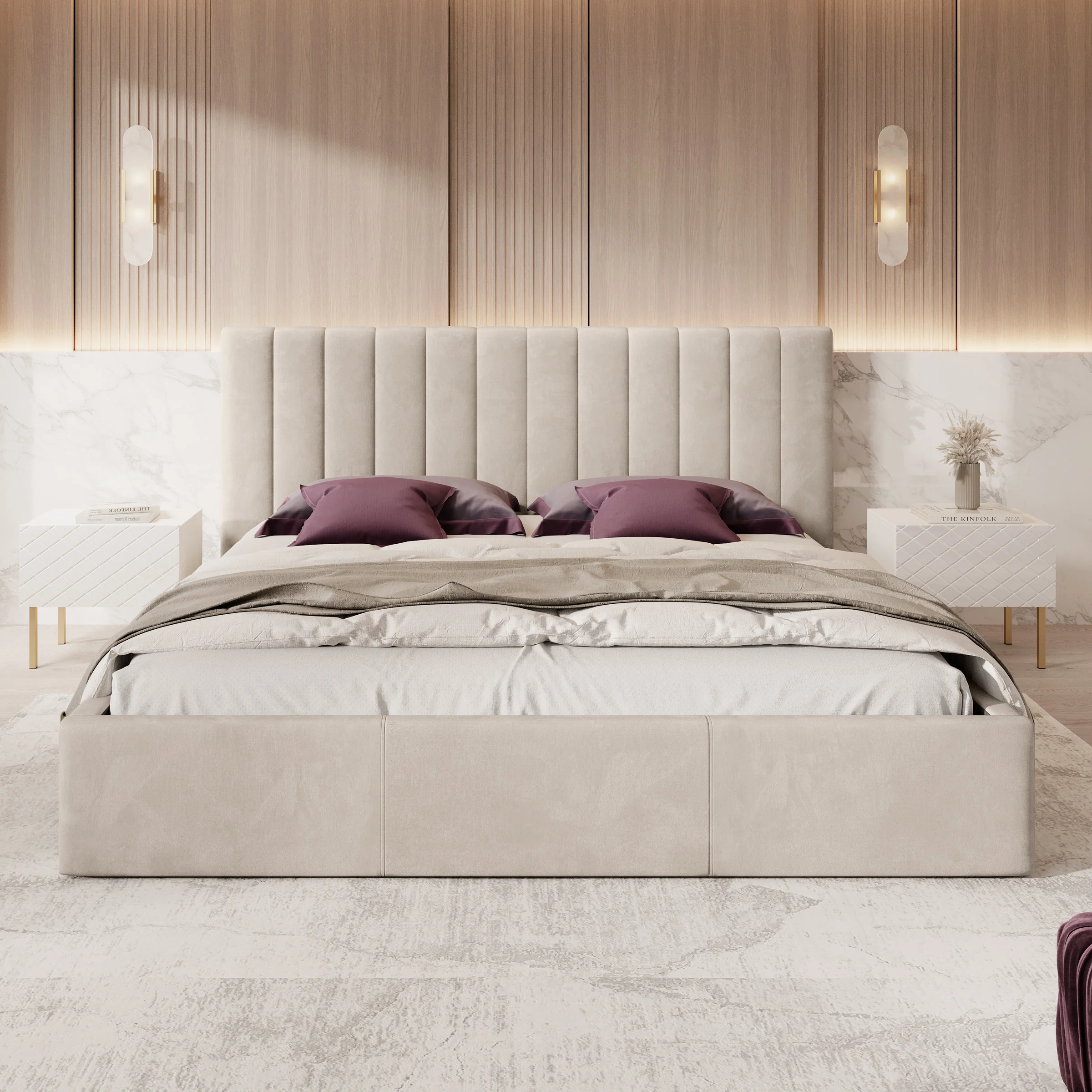 Tweepersoonsbed Chief is een modern bed in beige kleur, volledig bekleed met een sterke en onderhoudsvriendelijke velvet stof. Het hoofdbord is afgewerkt met verticale siernaden, wat het bed een stijlvolle en luxueuze uitstraling geeft.