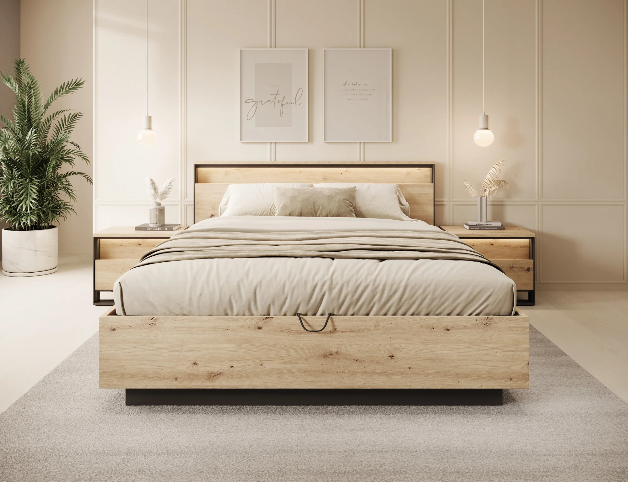 Tweepersoonsbed Quarry is een bed geschikt voor matrasmaat 160x200 cm. Het meubel is gemaakt in een eiken kleur met zwarte details. Het hoofdbord beschikt over LED-verlichting. Het bed wordt geleverd zonder matras. De lattenbodem is wel inbegrepen. Deze lattenbodem beschikt over een gasliftsysteem. Hierdoor kan je de bodem omhoog kantelen zodat er opbergruimte ontstaat. Handig voor bijvoorbeeld kussens, beddengoed of dekens.